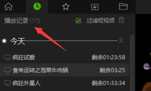 3.点击时钟图标之后会弹出我们的播放历史记录窗口,在弹出的播放历史纪录窗口中可以看到我们以往所有的视频播放记录。