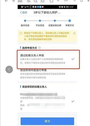 如实填写本人扣除比例,点击“下一步”,选择申报方式,点击“提交”,确认信息后点“继续提交”。查询到记录后,填写完成。