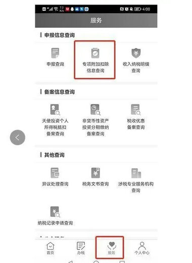 进入“个人所得税”APP后,点击“服务”——“专项附加扣除信息查询”