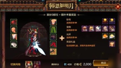 导师套礼包:这套礼包价值200RMB,里面包含了,一套高级时装、称号、宠物、光环,并且这里面还包含有黑钻特权和首冲奖励。