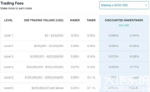 挂单(Maker)手续费较低,吃单(Taker)手续费会高一些,会随着质押CRO币的数量有更多交易手续费折扣,手续费如下图,其他质押数量折扣请至交易所页面有详细资料。