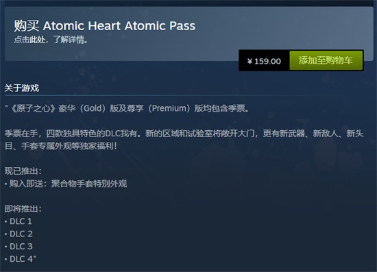 原子之心季票steam国区售价159元,黄金版和高级版是已经包含季票的。