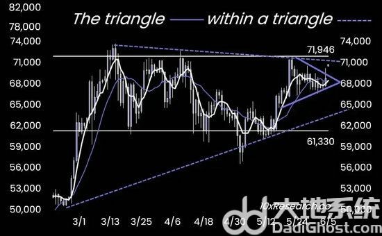 比特币当前已经突破了下图中的较小的三角形区间(紫色线),较大的三角形区间(紫色虚线)可能也将在 71500 美元左右被突破。如果美国就业率的下降或通胀率的降低可以使比特币的价格收盘在此线以上,我们将坚决地把目标价格设定在新高的位置,这可能会在本周五到下周三之间达成。因此我们预计到下周末,比特币将创出新的历史高点(超过 73500 美元)。