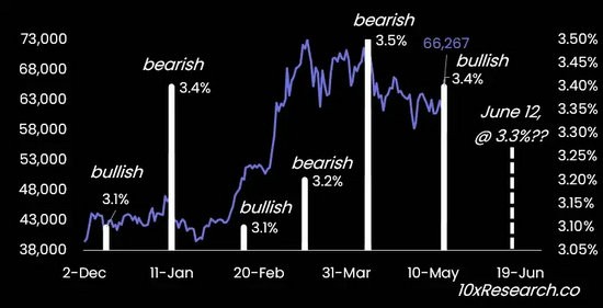我们将在这周五获得更多的就业数据,下周我们将获得 CPI 通胀报告。比特币的走势会根据 CPI 的高低变化调整方向(CPI 上升,比特币看跌;CPI 下降,则看涨),如果 CPI 的增长率为 3.3% 或更低,很可能会推动比特币达到新的历史高点。