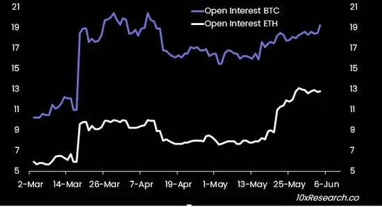 期货未平仓合约已从五月中旬的 80 亿美元增至 128 亿美元,融资利率在某几天内一度超过 20% ,然而现已降至 11.9% ,因为没有新的多头被部署,持有多头的成本非常昂贵,由于 ETF 获批时机的不确定性,可能会有更多的交易者选择平仓。