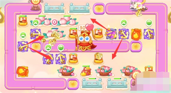 6、最终布局如图所示,在中间全部放置输出即可,因为没有减速炮塔所以容易漏跑车兔,建议一倍速慢慢打。