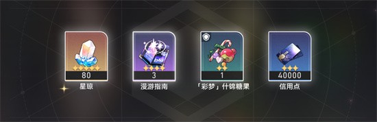 按要求提交相应食材后会获得80星琼(果然是变废为宝,好耶 ),3个漫游指南(角色升级材料),1个「彩梦」什锦糖果(名字真好听,结果吃起来是辣的)和40000信用点。这样第七天的美食「多味什锦彩梦糖」就完成啦!
