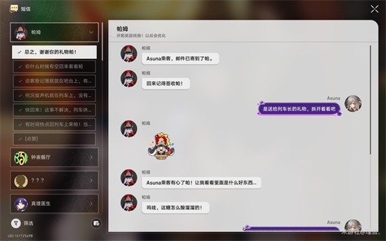 大家送给了谁呢,我是选择送给了帕姆,毕竟帕姆不能离开列车独守空车,就当作给空巢帕姆的一点关爱帕选择帕姆后会触发和帕姆的对话,这就是星穹列车一家人吧,看的人心里暖暖的