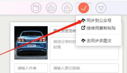 7、然后点击上方的“√”按钮,再选择“同步到公众号”就可以直接复制到微信公众号上发布该文章了。