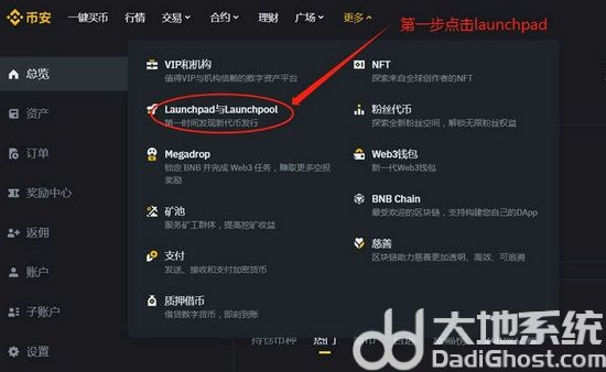 第一步:进入币安官网(点此注册)首页点击更多,选择launchpad